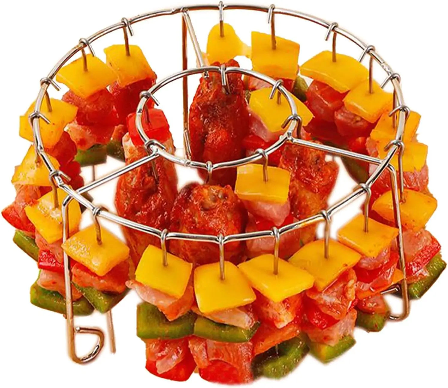 La Parrilla Circular de 26 cm con 18 Ganchos es la herramienta perfecta para asar brochetas, carnes, verduras y más de manera uniforme, práctica y deliciosa. Su diseño circular permite colgar múltiples alimentos al mismo tiempo, logrando una cocción pareja y un sabor irresistible. Compacta, resistente y fácil de usar, es ideal para asados familiares, reuniones con amigos o incluso para la cocina diaria.